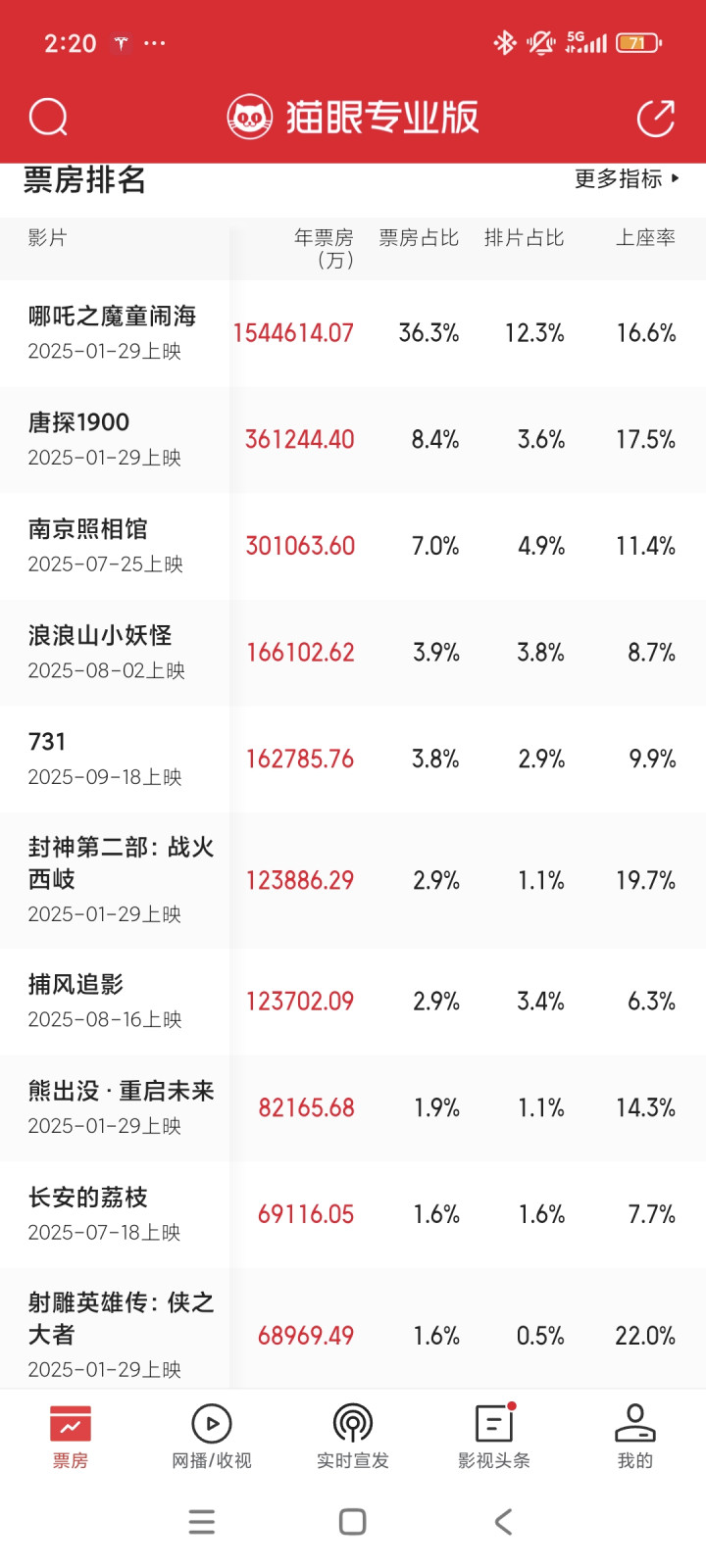 截至当日,国产电影票房占比89.7%,年度票房榜前十均为国产电影。